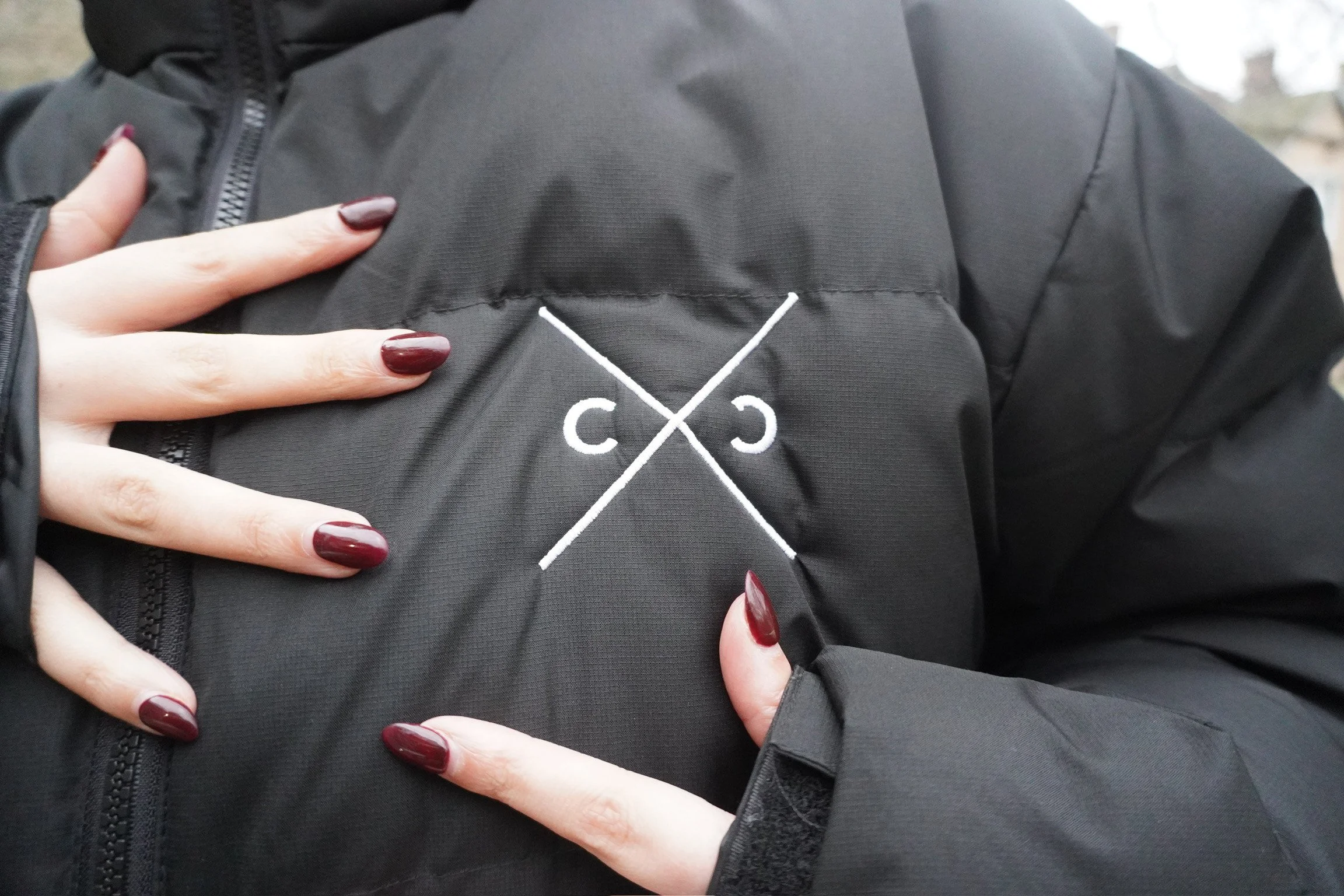 The pops of red in the hoodie underneath and burgundy nails provide a nice contrast with the puffer's white and black, highlighting once again the versatility of these puffers. The sleek and chic design of Concrete Catwalk’s logo is on show on this puffer, spotlighting the overall coolness of Concrete Catwalk. The fashionable logo makes it known to everyone that this puffer belongs to a fashion club.