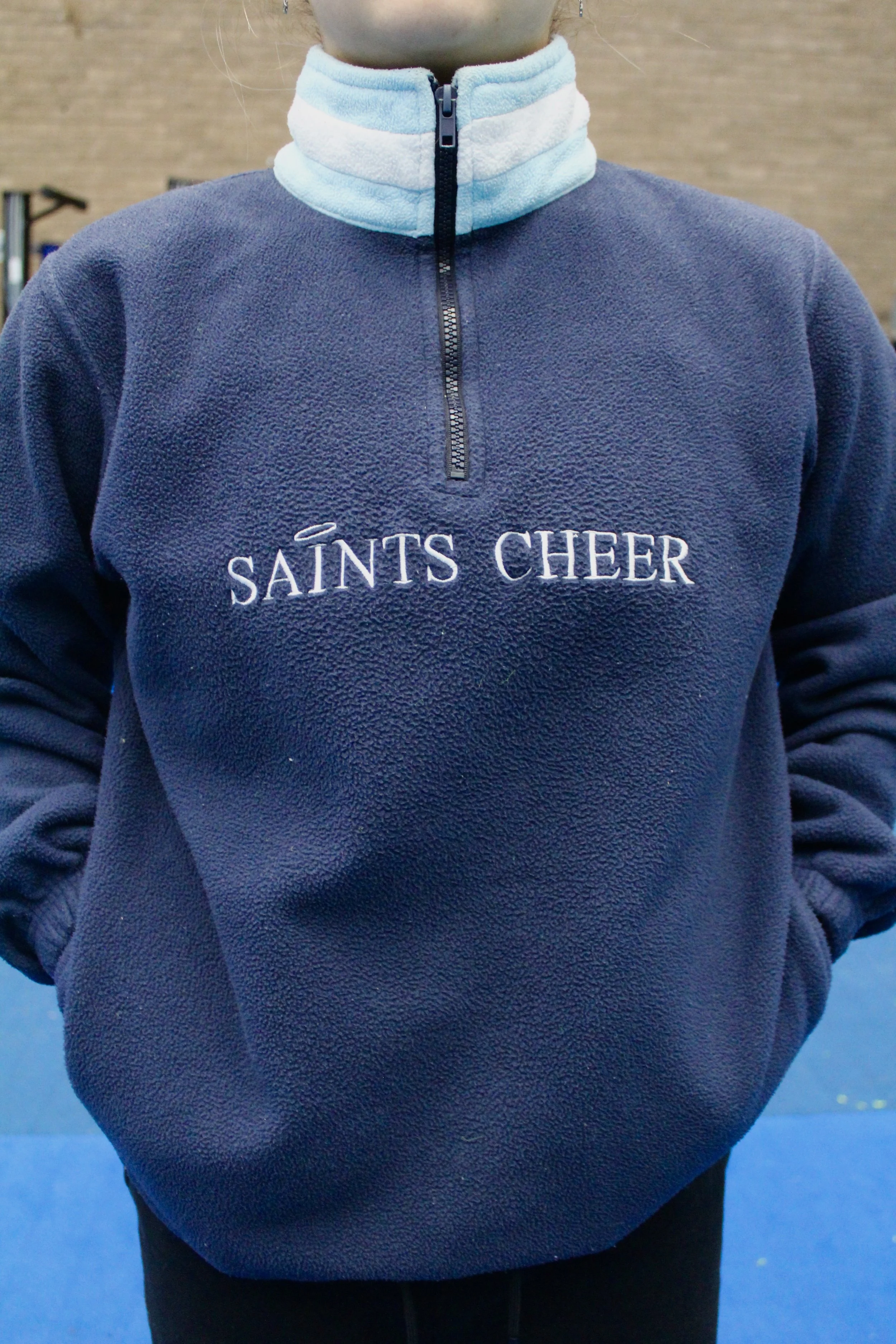 Speaking of comfort and versatility, the Saints Cheer fleece is a standout piece of sportswear that has captured the hearts of athletes across teams. Michelle Rebeca Becerra de San Cristobal proudly shows off this fan favourite, which again serves the dual purpose of fashion and functionality, while also embodying the spirit and camaraderie of the St Andrews sports community. Designed for warmth and comfort, this cozy fleece is perfect for chilly 7am practices, competition days, or late-night study sessions in the library, making it a versatile wardrobe staple for our St Andrews athletes. Beyond its coziness, this fleece fosters camaraderie. Its recognizable design allows athletes to easily spot one another around campus, creating instant bonds and reminding everyone of the shared passion and pride that comes with being a Saint.