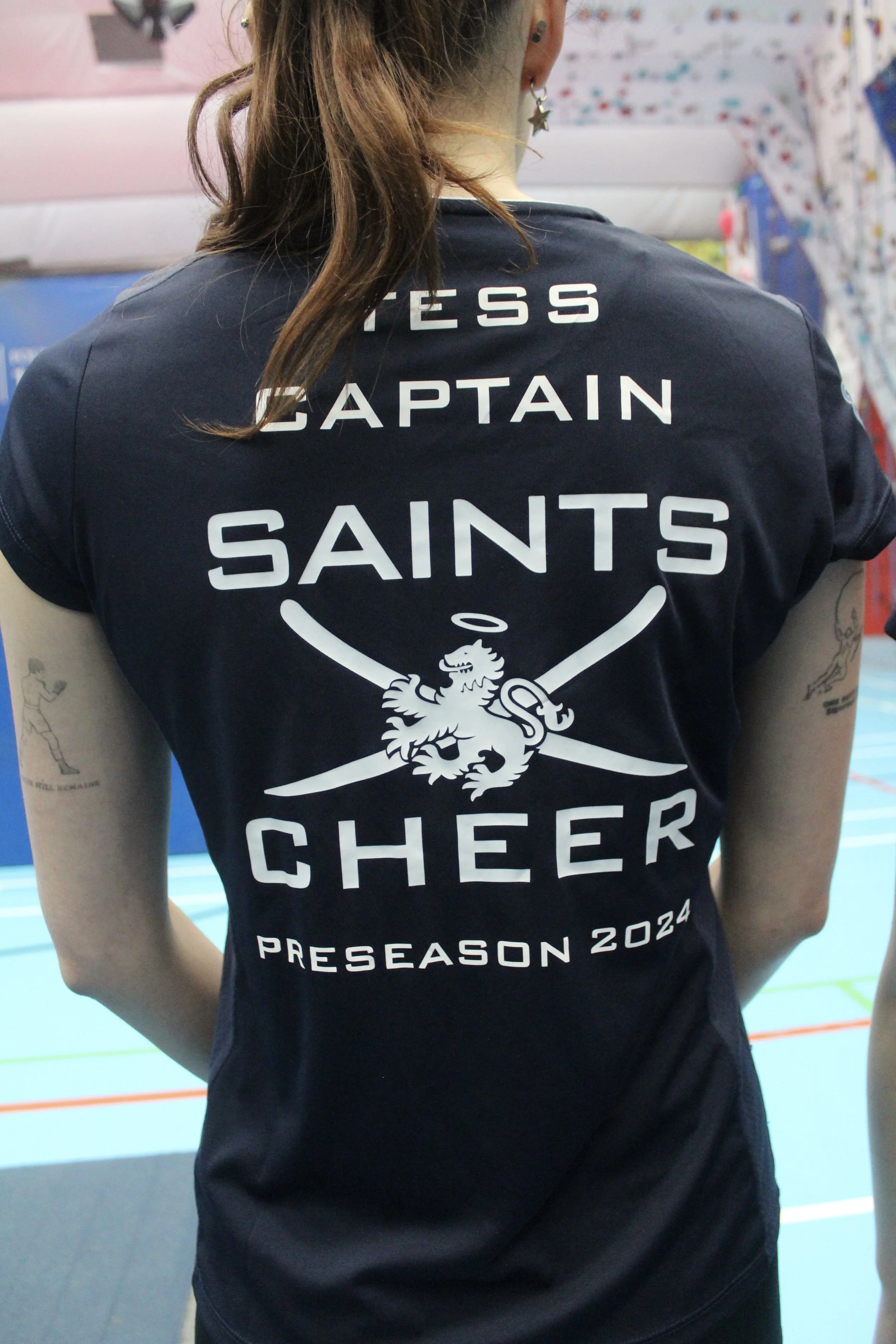 Take a look at Alice Grossman, wearing one of the preseason cheer shirts for 2024 —a piece that can be considered the preseason uniform in its own right. These shirts, emblazoned with Saints team colors and logos do more than look cohesive; they create a sense of unity. They remind athletes that every individual effort contributes to a shared goal: to work and perform together. This uniformity is critical for team bonding, especially in a sport that thrives on synchronization and group dynamics. It’s not just about looking the part; it’s about feeling like a unified whole. By wearing the same preseason cheer shirts, athletes are reminded that their individual efforts contribute to a greater collective goal while they tirelessly prepared for the upcoming season!