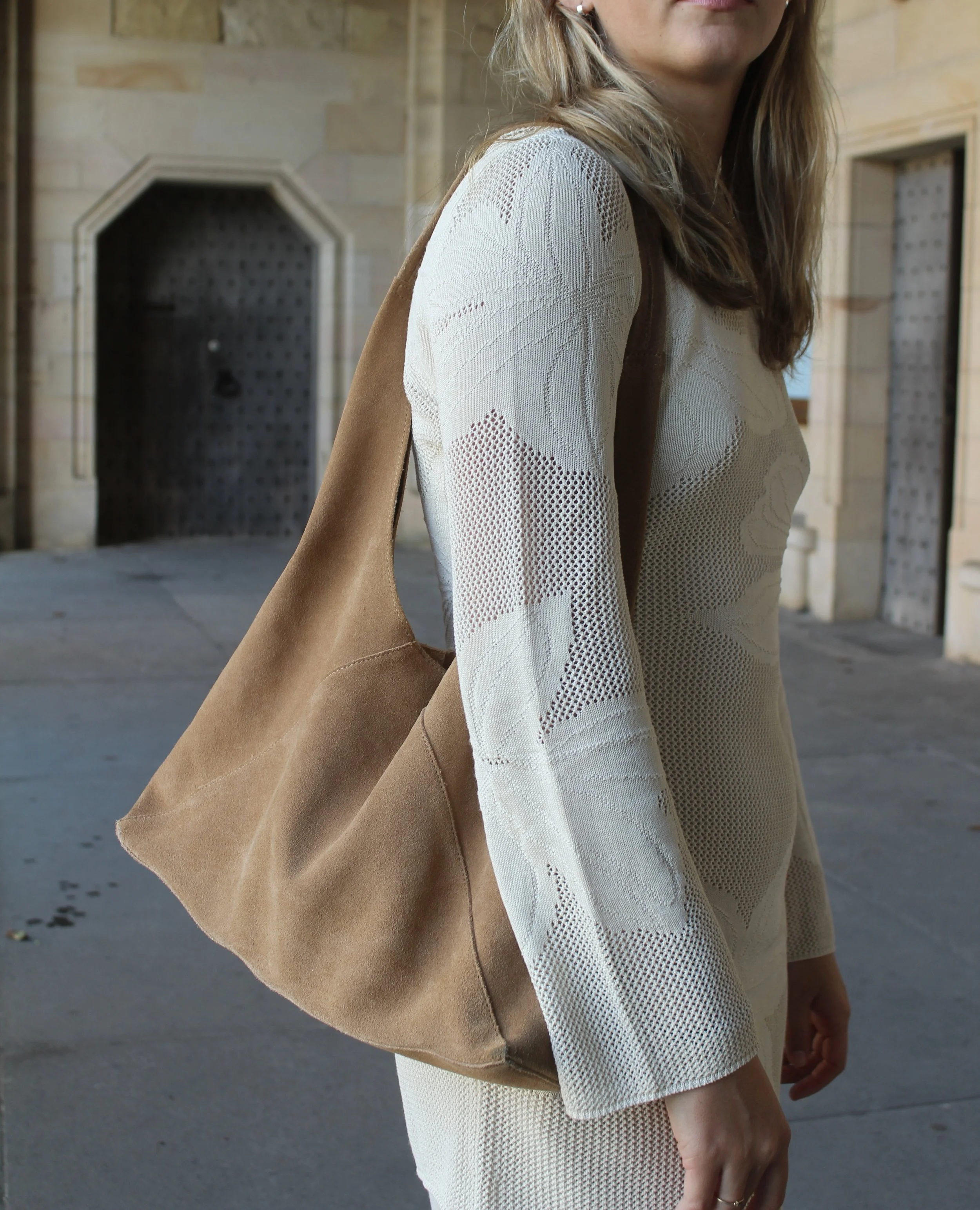 Here we see Pippa Ashworth wearing a white, embroidered, crochet dress purchased from Mango with a suede tote from Zara. The neutral palette, along with the texture and depth brought by the crochet design and the leather bag, perfectly showcases Marant’s style in a casual and timeless way, but most importantly, without the Marant price tag. Pippa also paired this outfit with a pair of brown Frye boots that have also been replicated by Amazon or Steve Madden.