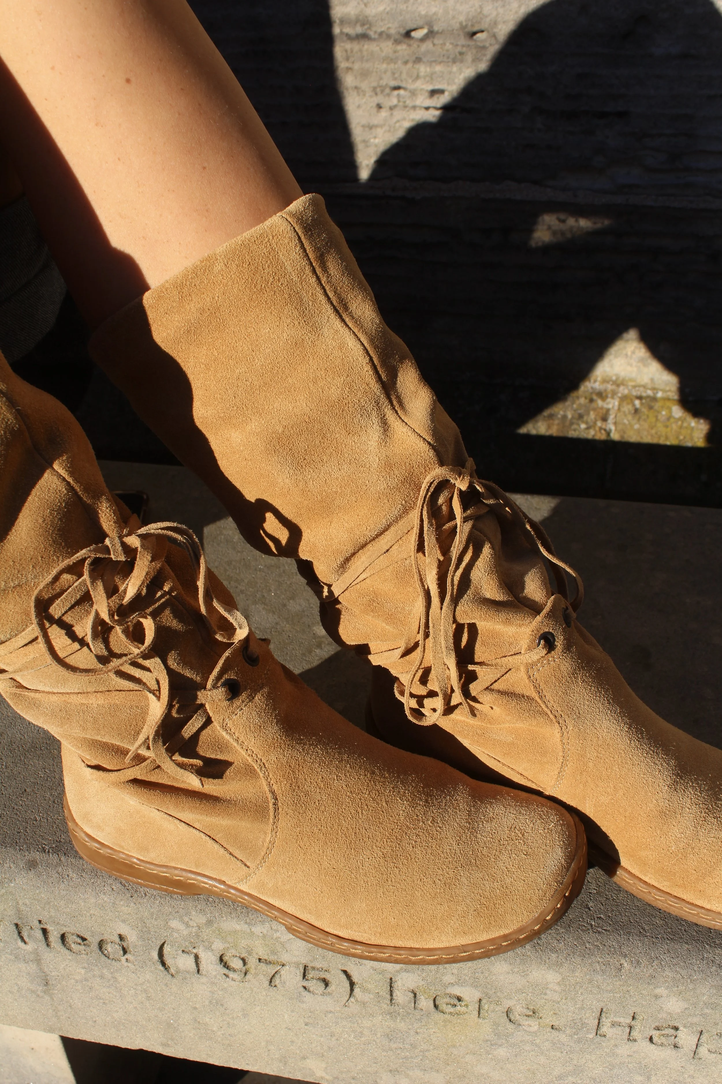 Soft suede, tie-up detailing, and cozy vibes, this boot whispers “library chic.” Often seen in Sallies or the Byre Theatre cafe, these moccasin-style boots are the definition of comfort meeting boho charm. They’re popular among students who love layering knitwear and listening to folk playlists while studying. It’s the perfect blend of cozy and cool for chilly coastal walks.