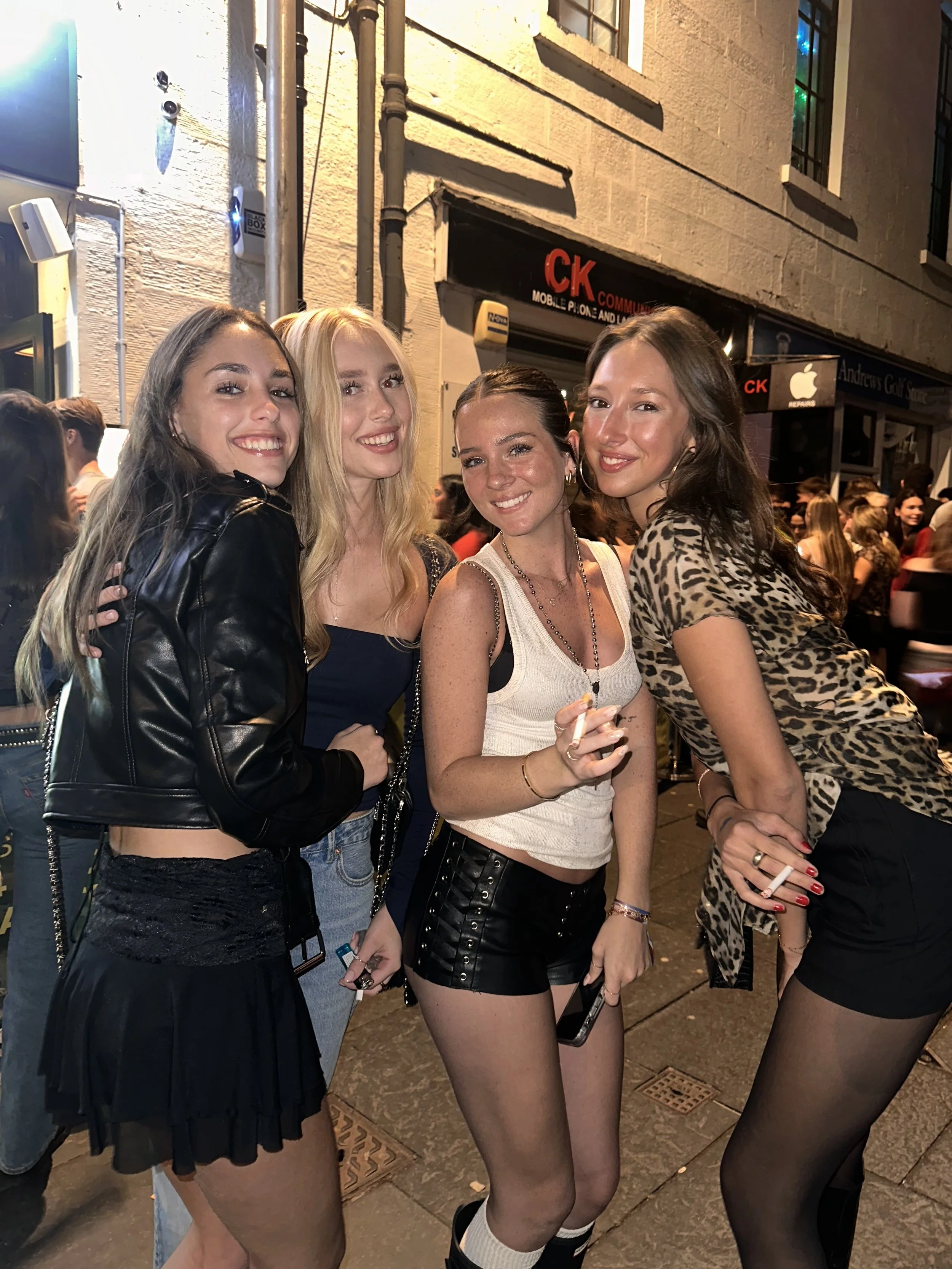 The black top, a staple in any night-out wardrobe, was seen in an array of textures and necklines, showing its versatility and timeless appeal. However, the fashionistas of St Andrews didn't stop there; they also embraced the increasingly popular white tank, adding a fresh twist to the classic ensemble.
